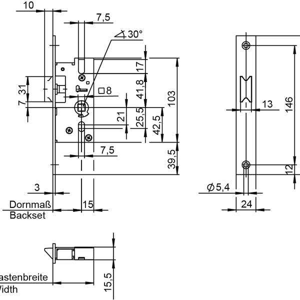 | Kastenbreite | Dornmaß + 15 mm |